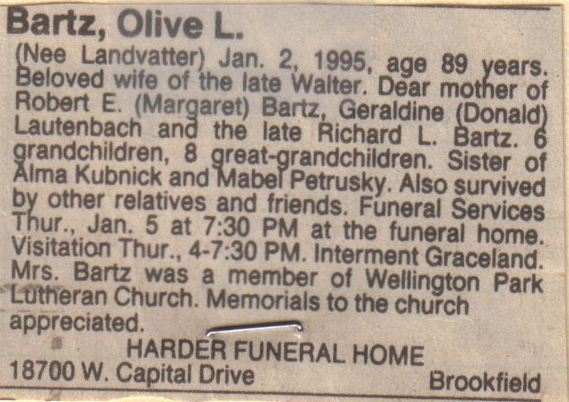 Olive is listed on page 262 and 263 in the Friedrich Seidemann Family Tree Book with her husband Walter, their children, grandchildren, great grandchildren, and great grandchildren. Olive is a 5th generation descendant of Friedrich and Rosina Seidemann and her genealogy line is as follows: Friedrich, Johanna, Paulina, Anna, and Olive.